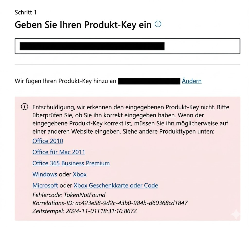 Der Fehler im Bild tritt auf, weil die Website setup.office.com nur für Home & Student-Versionen gedacht ist.