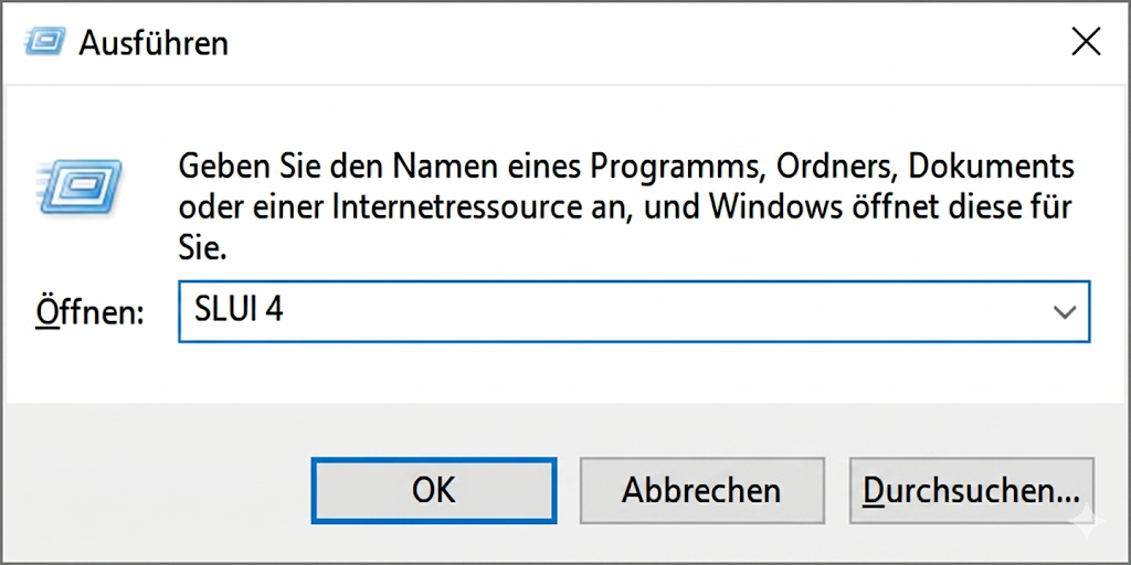 Drücken Sie die Windows-Taste + R auf Ihrer Tastatur, um das Dialogfeld „Ausführen“ zu öffnen. Geben Sie slui 4 ein und klicken Sie auf OK.