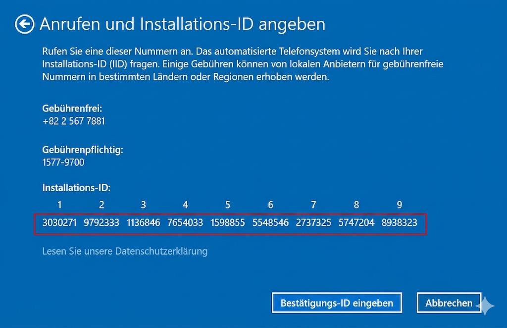 Rufen Sie die gebührenfreie Nummer an, die auf Ihrem Bildschirm angezeigt wird. Ein automatisiertes System wird Sie nach Ihrer Installations-ID (IID) fragen. Geben Sie die auf Ihrem Bildschirm angezeigten Zahlen über die Tastatur Ihres Telefons ein.