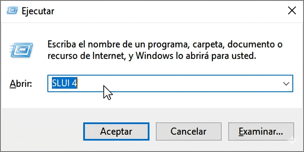 Presione la tecla Windows + R en su teclado para abrir el cuadro de diálogo Ejecutar. Escriba slui 4 y haga clic en Aceptar.